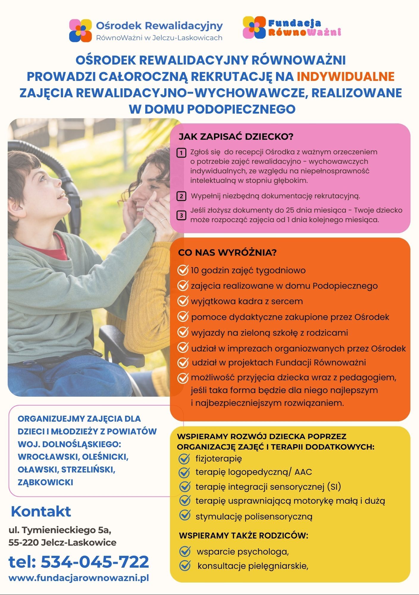 Jesteśmy kameralną placówką położoną w cichej, spokojnej dzielnicy z wygodnym dostępem do parkingu. Organem prowadzącym Ośrodek jest Fundacja RównoWażni, powołana przez rodziców Jowity, która od urodzenia zmaga się z głęboką niepełnosprawnością sprzężoną. Dzięki temu nasze działania nie są jedynie teorią – to praktyczna odpowiedź na realne potrzeby rodzin.