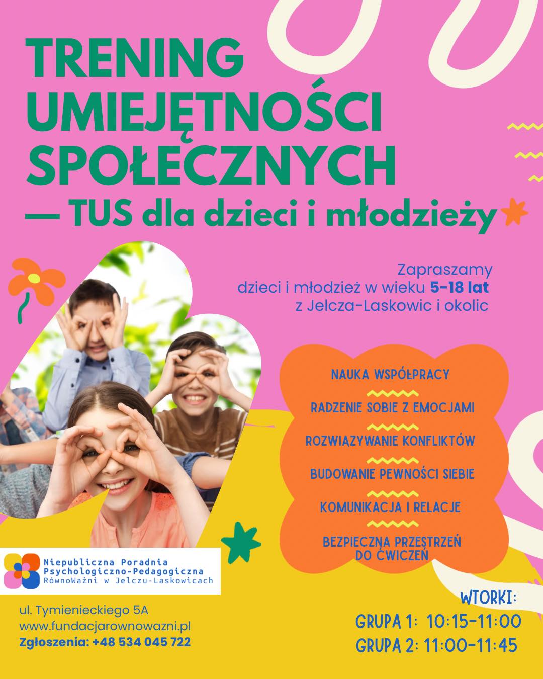 Niepubliczna Poradnia Psychologiczno-Pedagogiczna RównoWażni zaprasza dzieci i młodzież z Jelcza-Laskowic i okolic na Trening Umiejętności Społecznych (TUS).